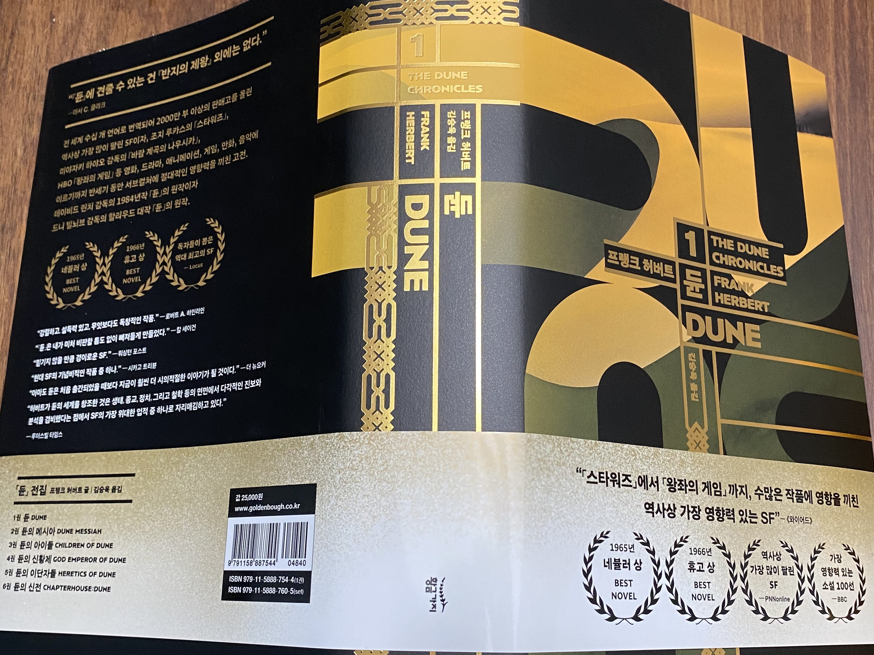 듄 영화와 관련해서 다시 한번 신장판으로 나왔다는 소식을 들었을때, 워낙 디자인이 예뻐보여서 내용과 관련없이 안살 수가 없었다. 배달되어온 책을 보니... 오.. 이쁘다. 이건 내용을 떠나서 디자인 만으로도 살 가치가 있는 책이다.